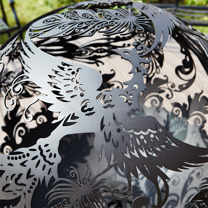 Уличный очаг Жар-птица Firecup представляет собой сферу из металла, на которой вырезана жар-птица руками профессионального мастера. Через многочисленные прорези просвечивает пламя, озаряя все вокруг. Несмотря на уникальный дизайн, кострище отлично вписывается в любую обстановку как во дворе, так и на природе.