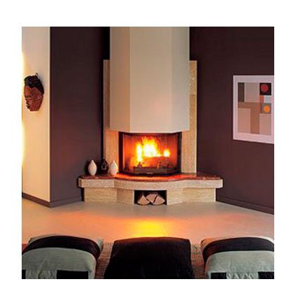 Угловой камин. Изготовлен из камня Castillon + красный "rocmarble" Corallin.