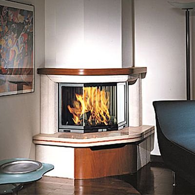 Угловой камин с боковинами и цоколем из бучардированного мрамора Trani, верхней балкой и дверцей в цоколе из дерева.