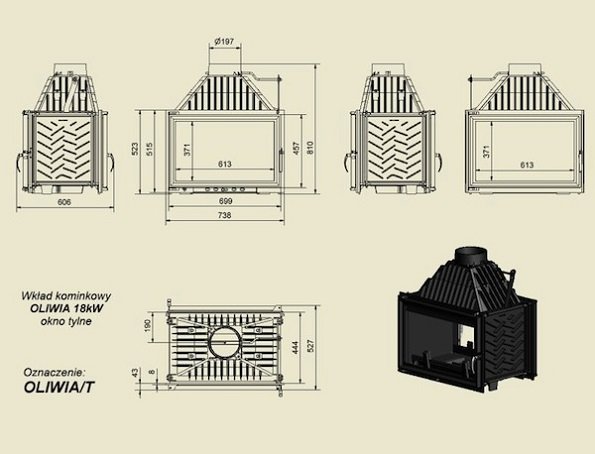 Oliwia/T - каминная топка из чугуна, выдерживающего высокотемпературный режим. Изготовлена  компанией KRATKI (Польша). Необычный дизайн (двустороннее сквозное остекление) позволяет использовать ее в островных каминах или печах, отапливающих две комнаты. Корпус покрыт сетью дополнительных ребер, увеличивающих полезную площадь теплоотдачи. Каминное топливо - сухие дрова. Материал окон - термостойкая стеклокерамика, с температурным порогом в 800 градусов Цельсия. Дверца топки открывается вбок.