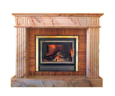 Этот классический портал выполнен из узорчатого мрамора светлого оттенка и отделан огнеупорным кирпичом. Он смотрится подчеркнуто элегантно в современном интерьере.